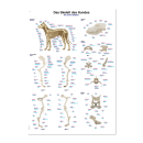 Die Lehrtafel Skelett des Hundes von Erler-Zimmer zeigt anschaulich den knöchernen Aufbau des Canis lupus familiaris. In 5 Abschnitten ist das Gesamtskelett, die Extremitäten, der Schädel, die Wirbel und das Becken abgebildet. Die Einzelteile sind farblich unterscheidbar in Deutsch, Englisch und Latein benannt.